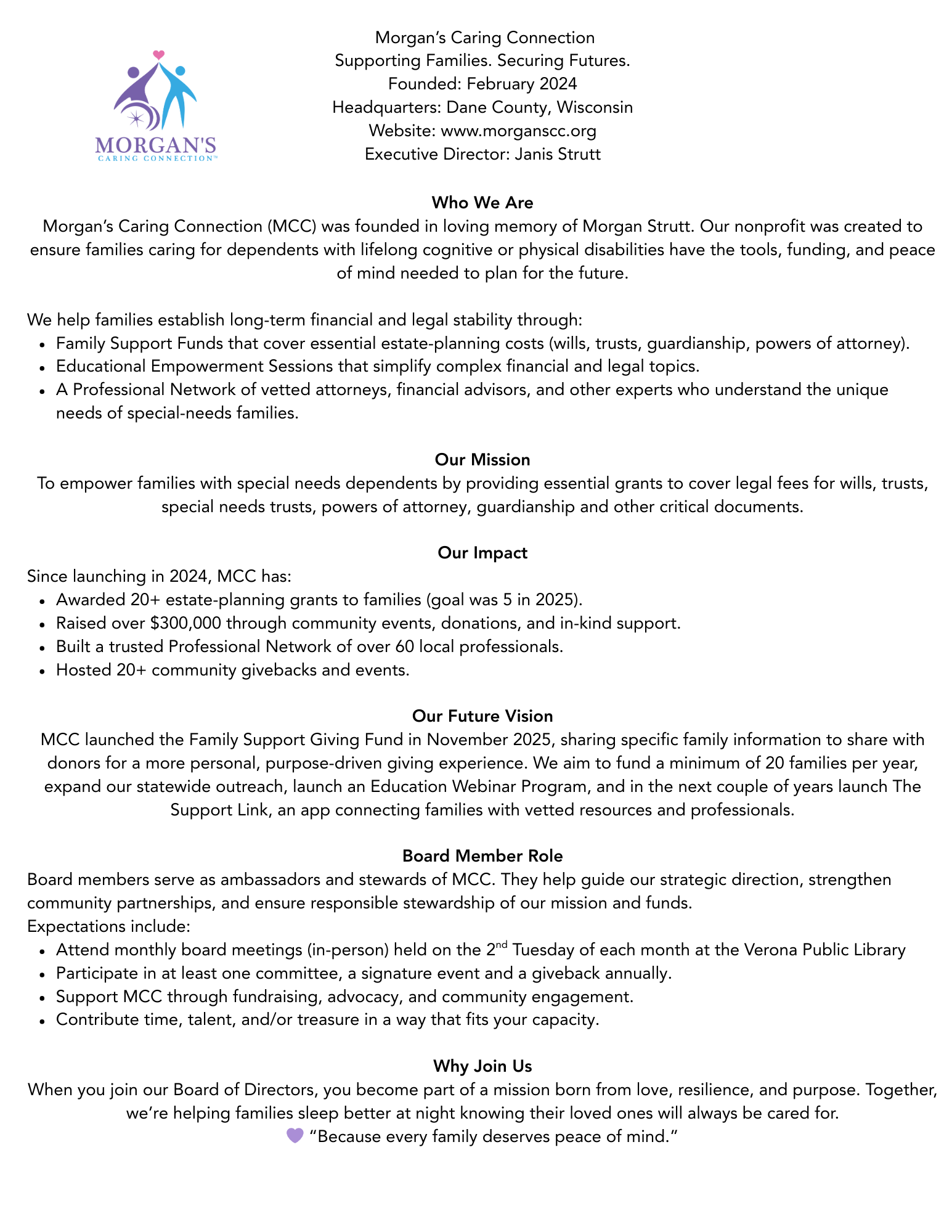 With a personal connection to Morgan sharing the same hallways during his time at Verona Area High School, Haakon is passionate about helping families in Morgan’s honor. With the level of passion and commitment to serve others observed throughout the MCC team, it quickly became clear that he wanted to play an active role to expand the impact of providing resources and support to families with special needs dependents.